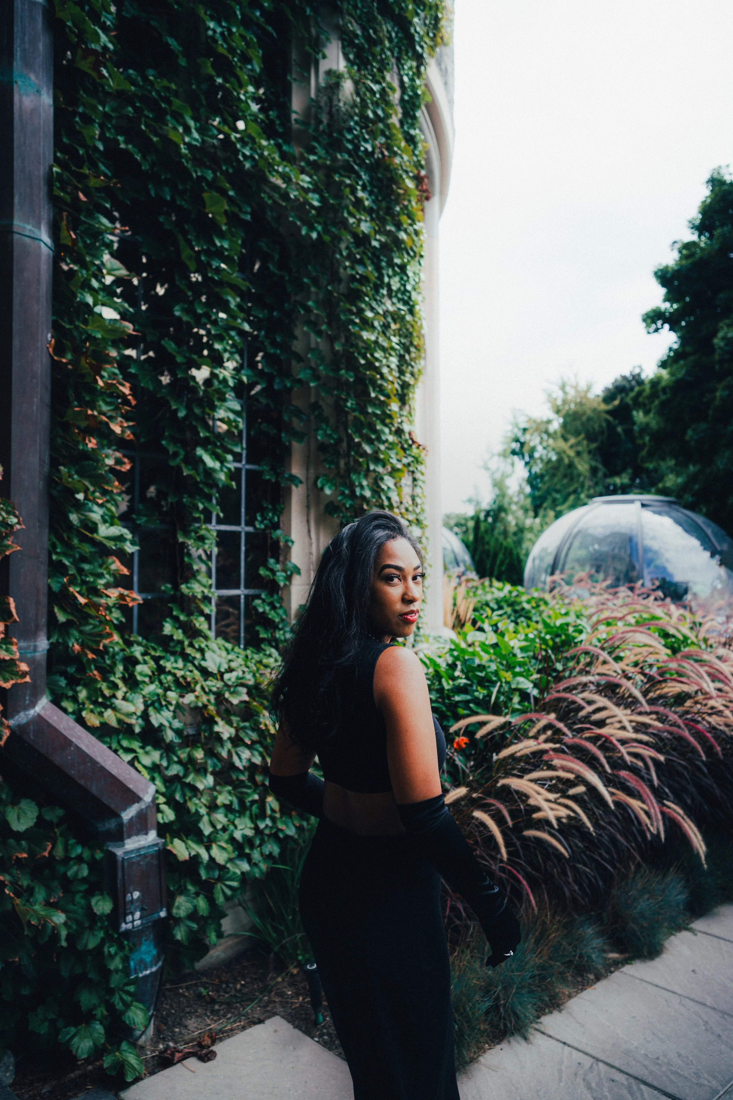 A woman with long black hair wearing a black sleeveless dress and black gloves, standing outdoors next to a building covered in green ivy plants and some pink and green ornamental grass, with a pathway and glass domes in the background.