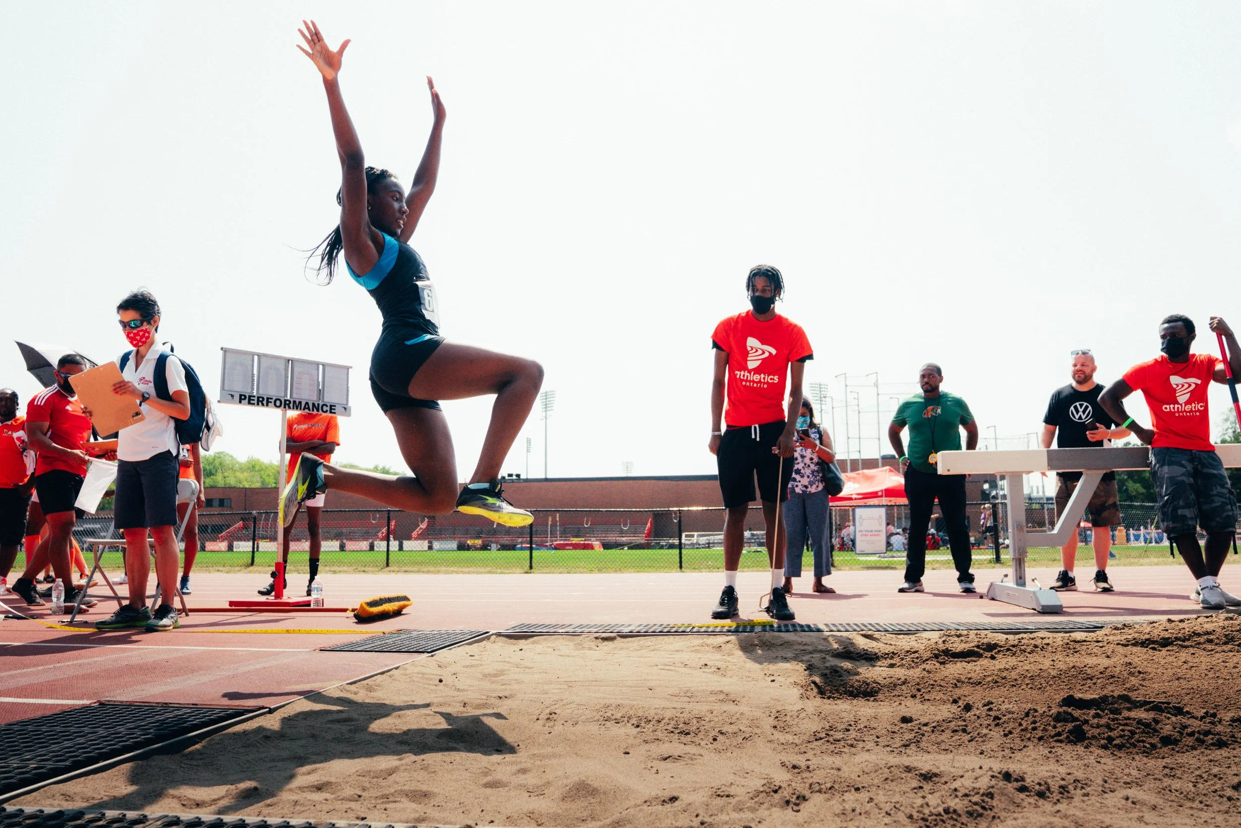 Athlete in mid-air during a long jump competition at an outdoor track and field event, with officials and spectators nearby.