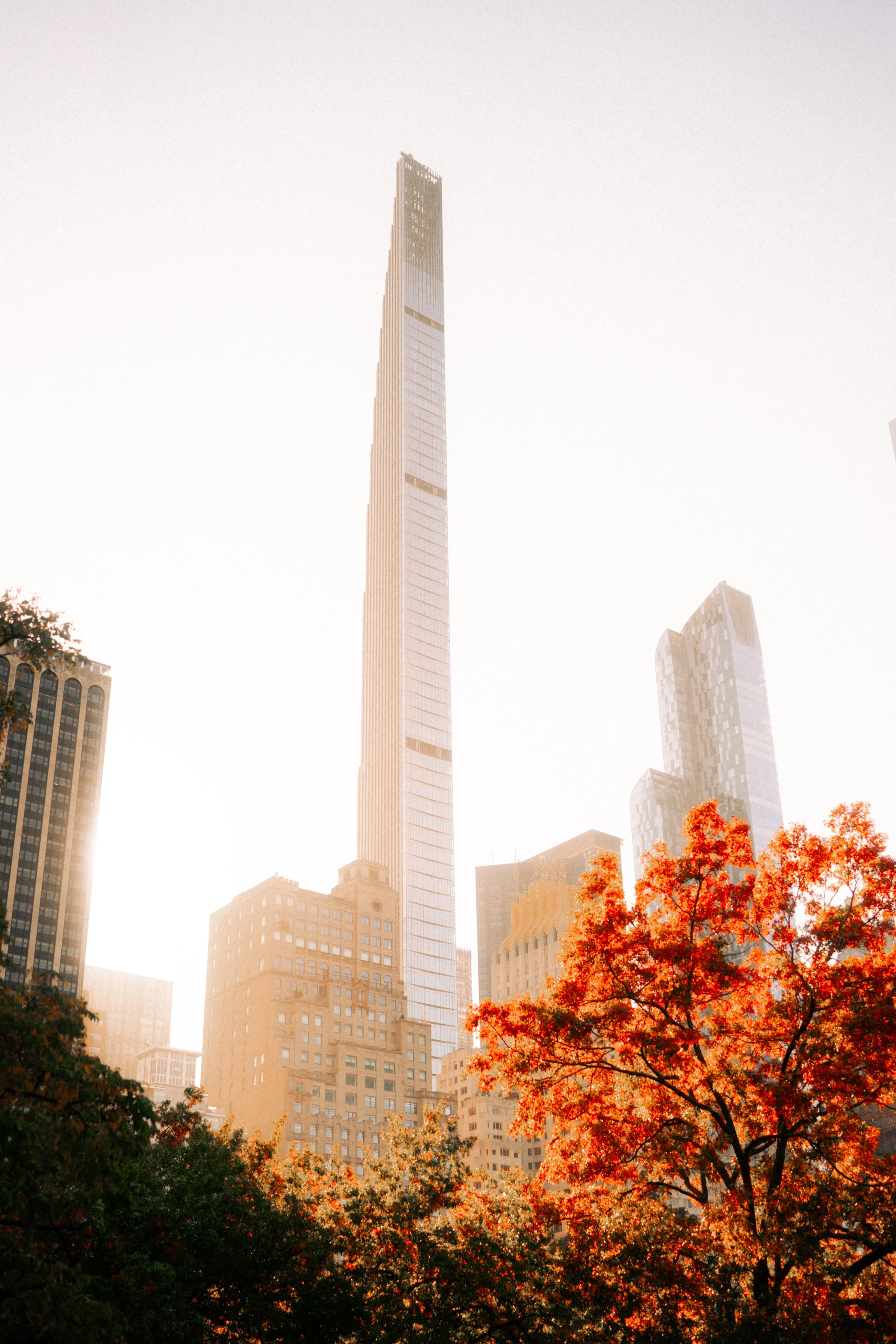 A city skyline with tall skyscrapers and autumn-colored trees in the foreground, including the prominent slender building in the center.