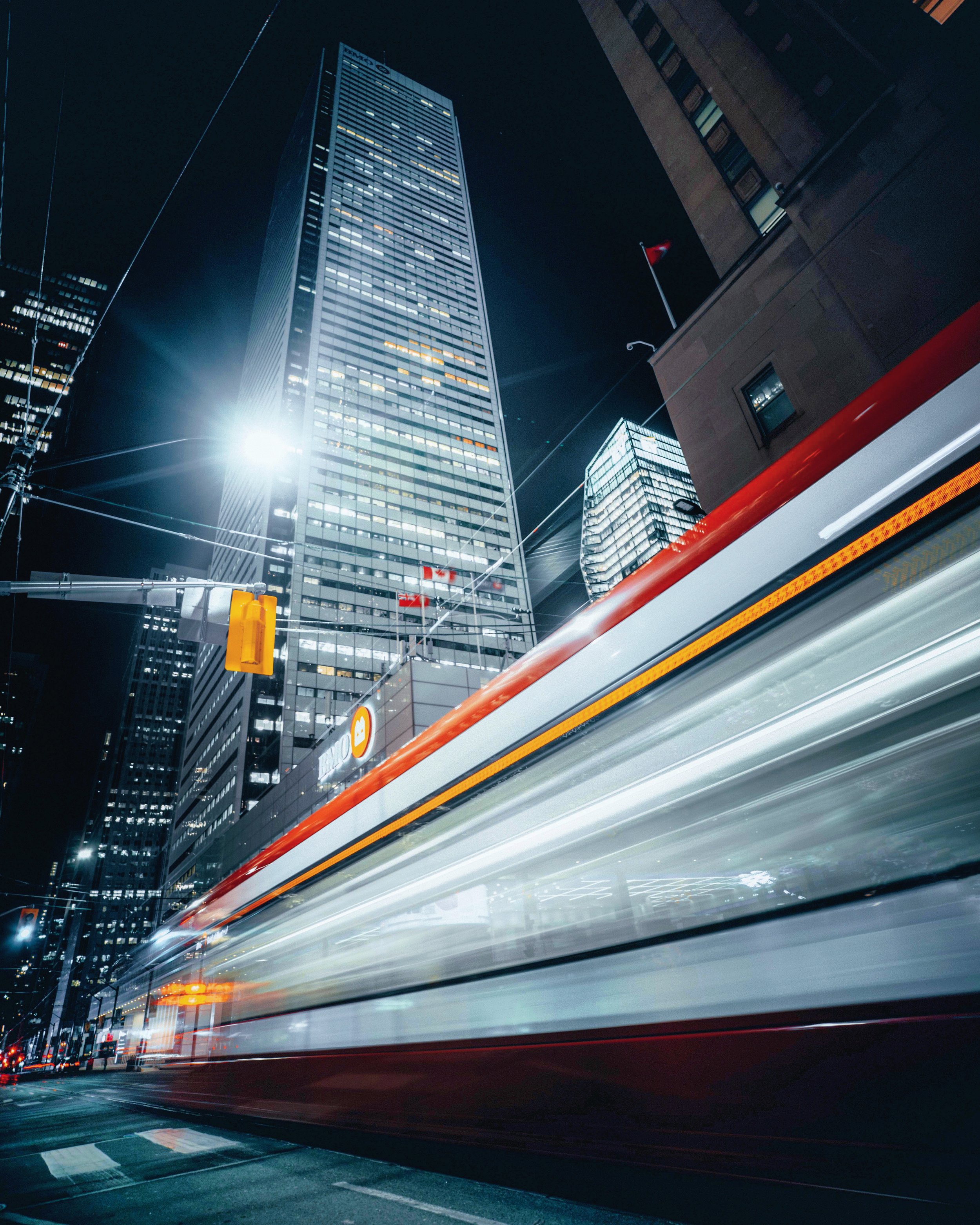 Nighttime cityscape with tall skyscrapers, bright lights, and a streaked motion blur of a bus passing through the street.