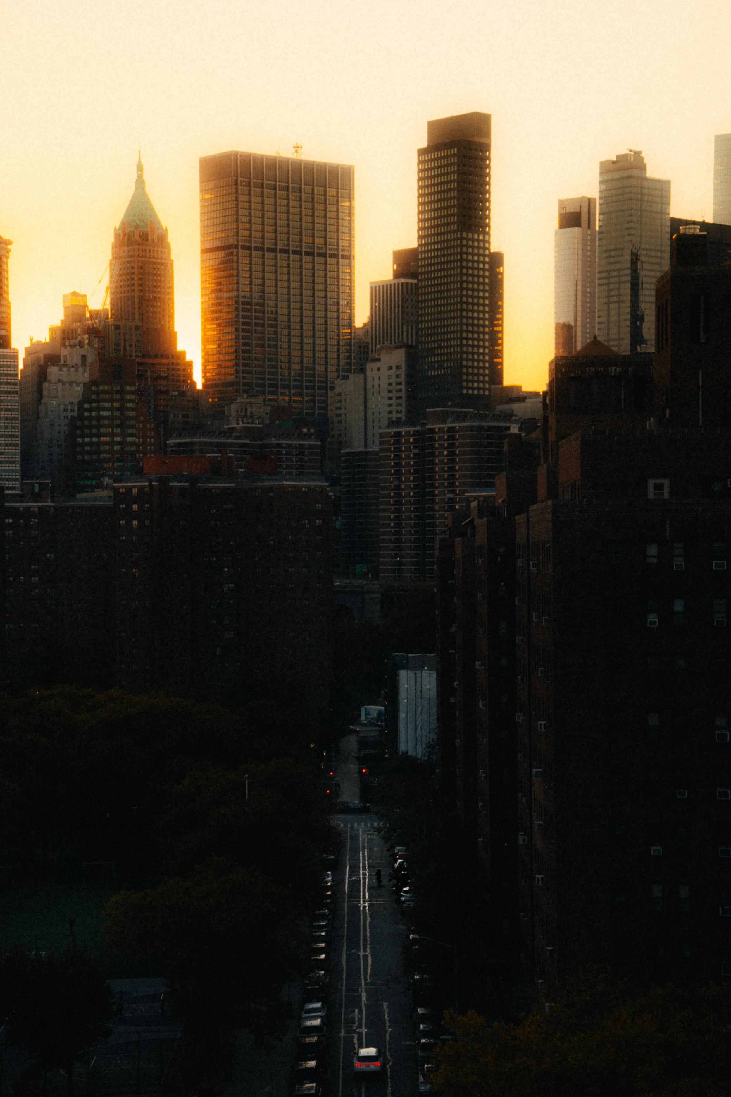 Sunset over Manhattan skyline with city buildings, water, and traffic below