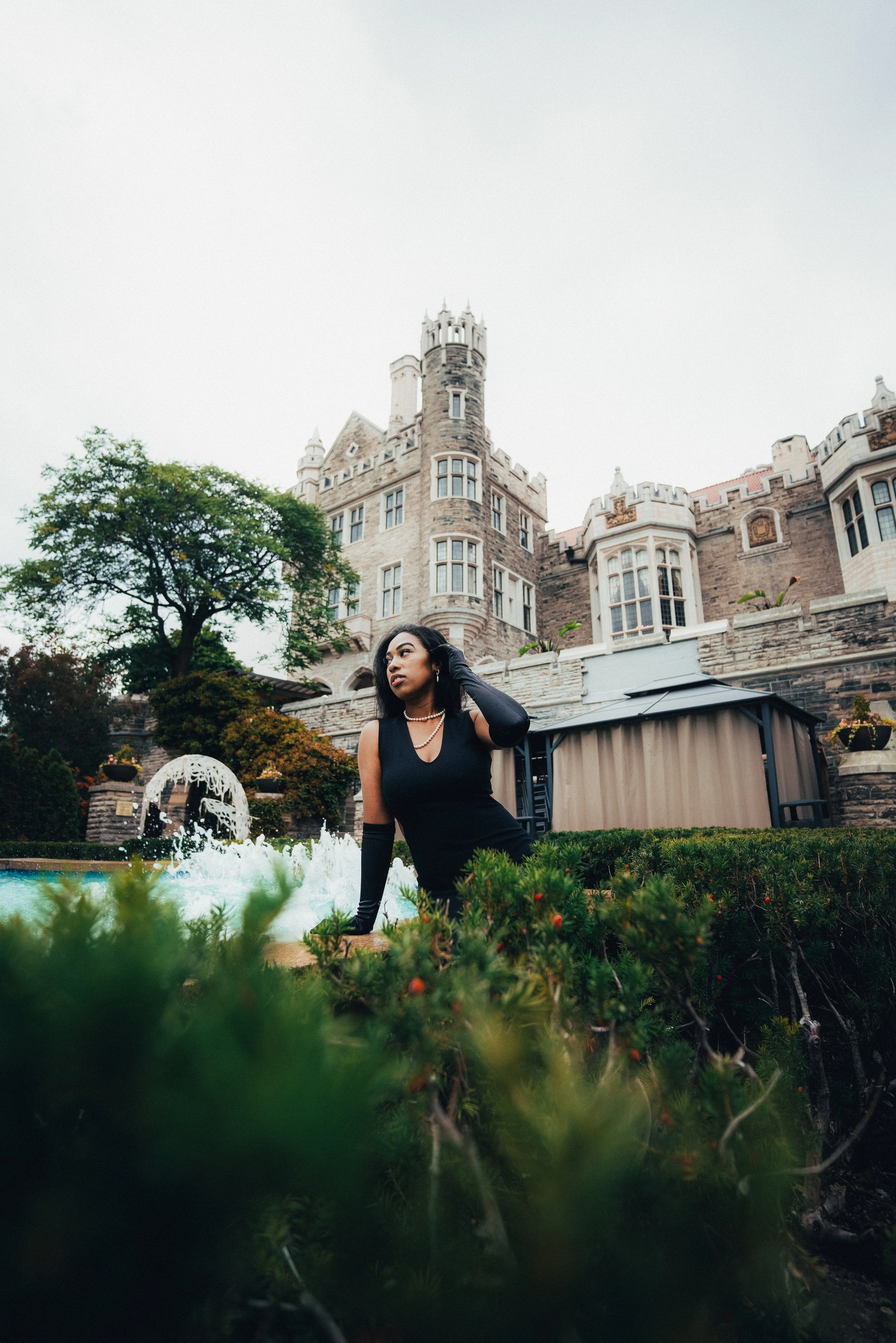 A woman in a black dress and long gloves standing near a fountain and hedge in front of a large castle-like building.