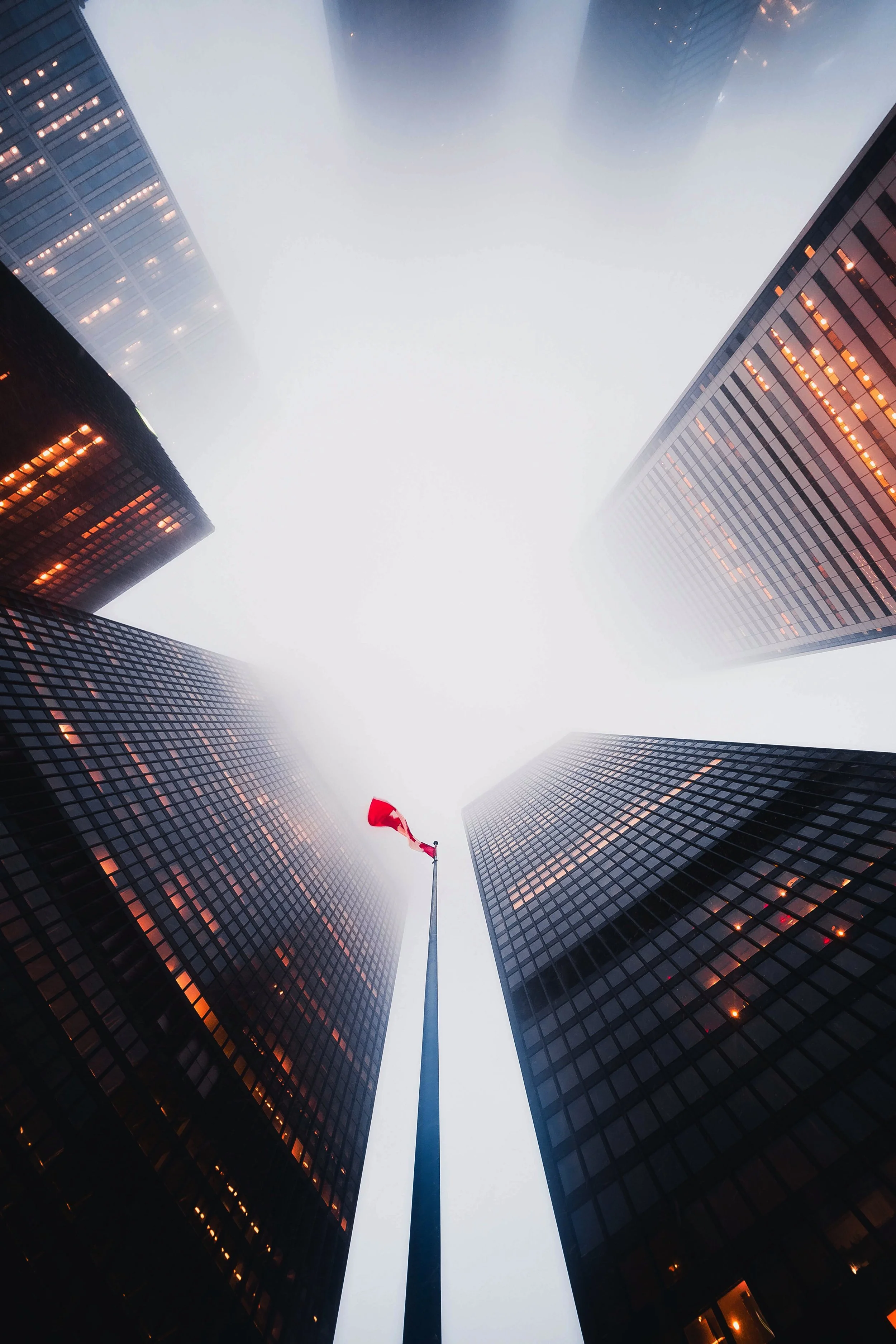 Looking up at tall skyscrapers with glass windows and a cloudy sky, a single flagpole with a red flag is visible in the center.