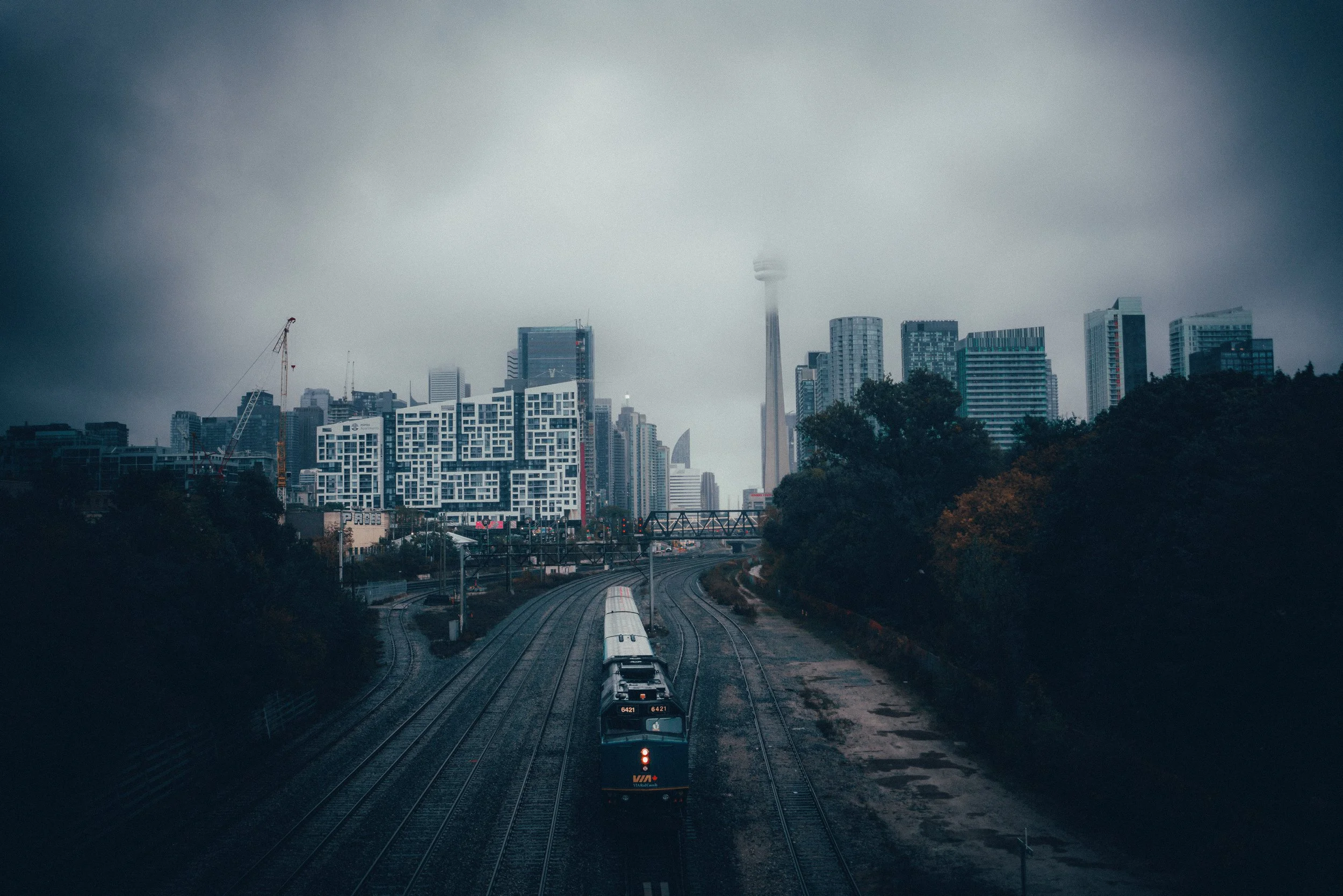 A train traveling on tracks through a city with tall modern buildings and a cloudy sky in the background.