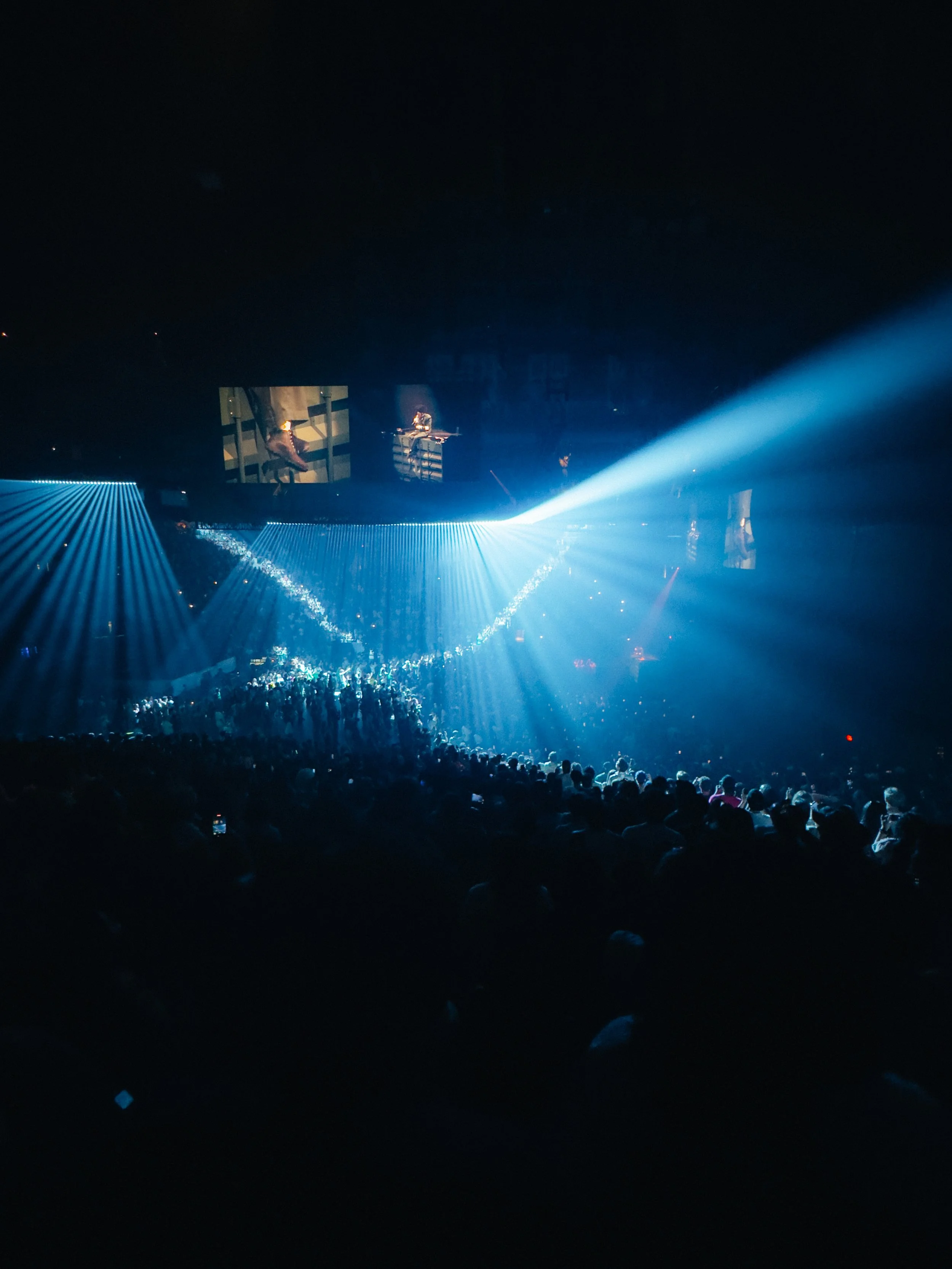 A concert hall with bright blue stage lights and large screens displaying performers, with a crowd of people watching.