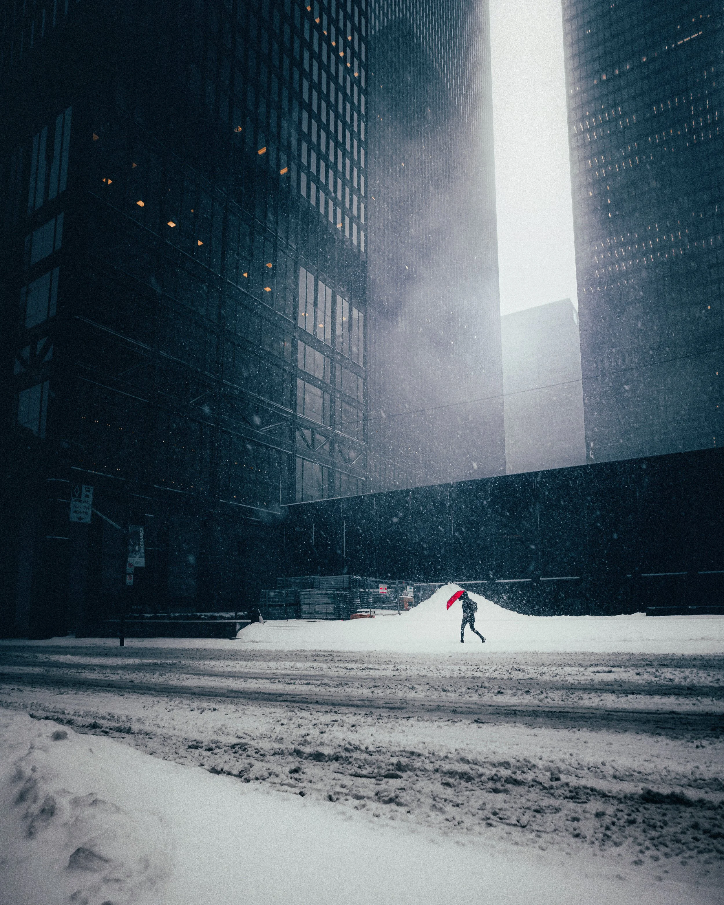 A person walking with a red umbrella in a snow-covered city street surrounded by tall skyscrapers during a snowstorm.