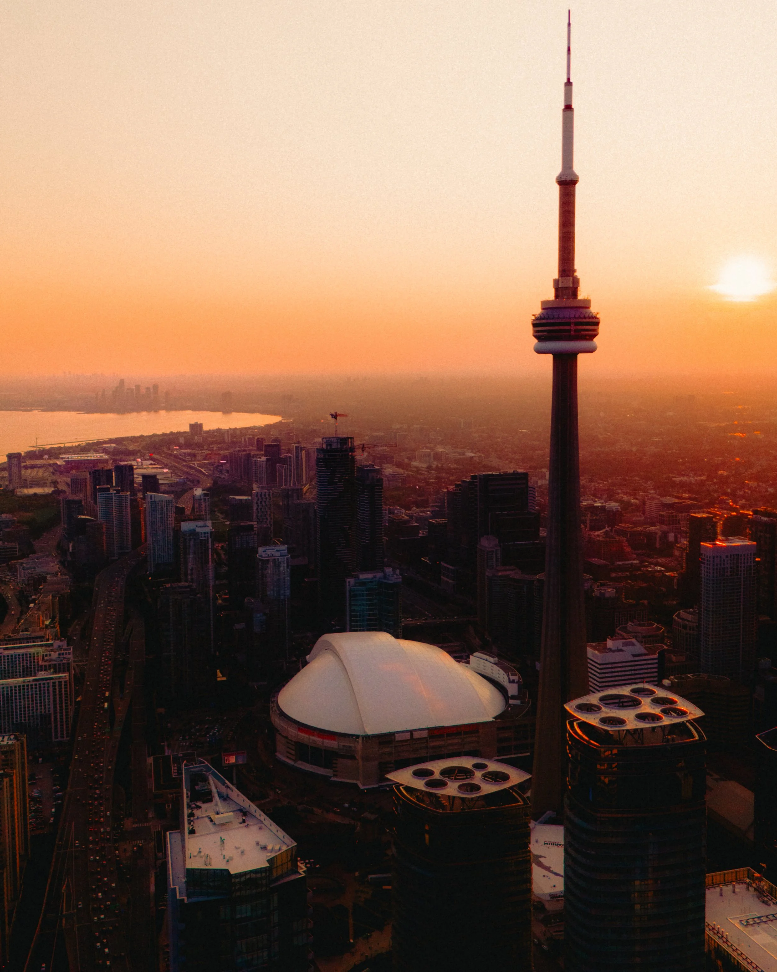 Aerial view of Toronto skyline at sunset with CN Tower and Rogers Centre in foreground.